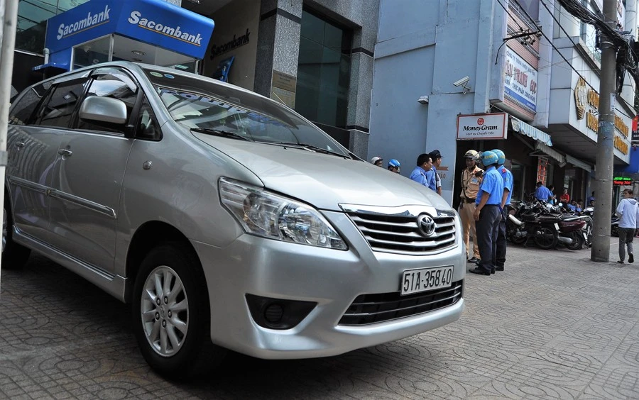 Tại một chi nhánh Ngân hàng Sacombank trên đường Nguyễn Chí Thanh (quận 11), một ô tô của ngân hàng này đậu vượt khỏi vạch kẻ cho phép đậu xe nên cũng bị lập biên bản. Ảnh: MP