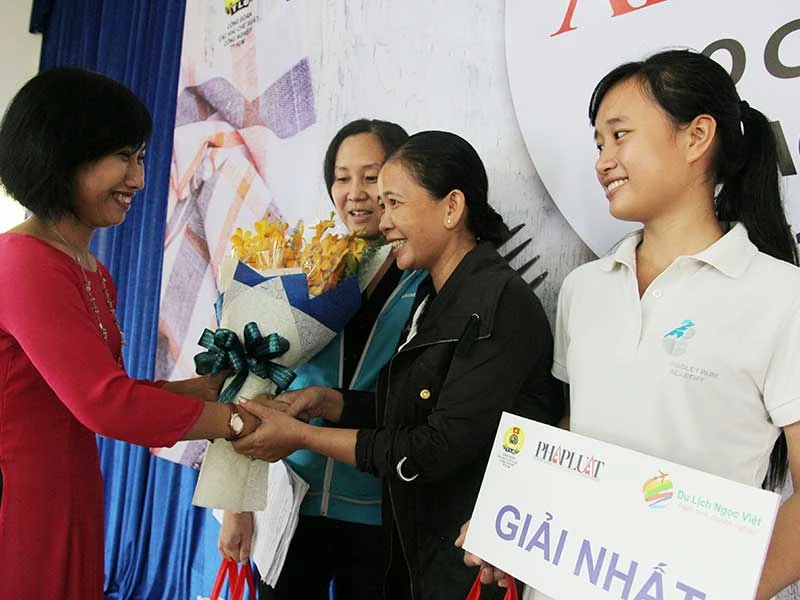 Bà Nguyễn Thị Thu Tâm, Phó Tổng biên tập báo Pháp Luật TP.HCM, trao quà cho đội đạt giải nhất. Ảnh: HOÀNG GIANG