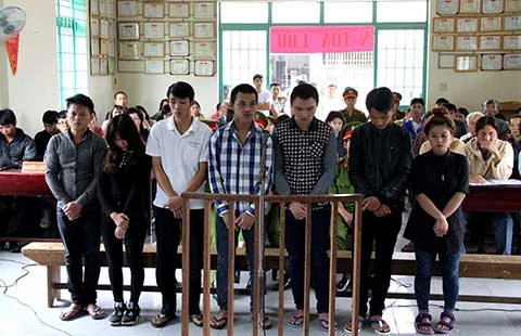 Hai bị cáo Minh và Hòa (thứ tư và thứ năm từ trái qua) tại phiên tòa. Ảnh: K.TRANG