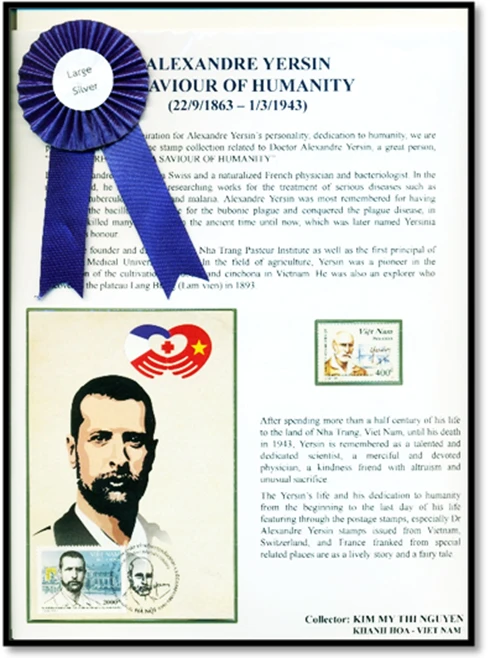Bộ sưu tập tem với chủ đề Alexandre Yersin – Vị cứu tinh của nhân loại của bà Nguyễn Thị Mỹ Kim dày 80 trang, gồm 6 chương, với 21 chuyên mục, trình bày tem và các ấn phẩm bưu chính về Yersin với quê hương; quá trình học tập và nghiên cứu; những cống hiến rực rỡ về y khoa, nông học; quyết định đến Đông Dương và chọn Nha Trang- Khánh Hoà làm nơi sinh sống và làm việc,… Trong đó, đặc biệt là chương V gồm những sưu tập tem về Cuộc sống của Ông Năm tại Xóm Cồn Nha Trang, gói ghém sự yêu kính, ngưỡng mộ của một người dân đất Khánh Hoà dành cho bậc thiên tài của nhân loại.