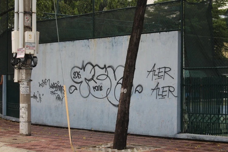 Một bức tường bị bôi bẩn bởi những nét vẽ nguệch ngoạc ở đường Trường Sa.