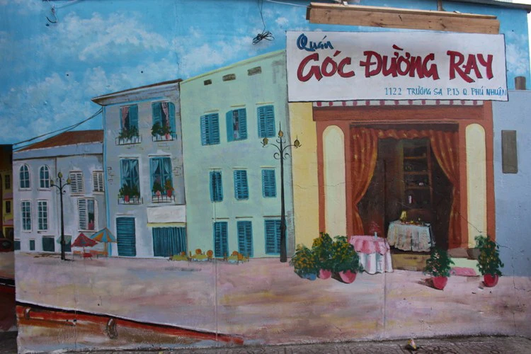 Dạo quanh thành phố, quán Góc đường ray (1122, đường Trường Sa, P.13, Q.Phú Nhuận) trở nên rất đặc biệt với mảng tường phía trước được trang trí bằng những nét vẽ rất đẹp và sống động. Hình ảnh đầu tàu xe lửa trên tường rất phù hợp với không gian thực tại của quán.
