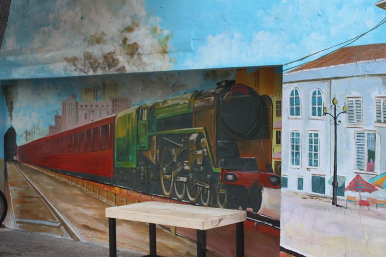 Bức tường được trang trí bằng hình ảnh đầu xe lửa rất đẹp trên đường Trường Sa.