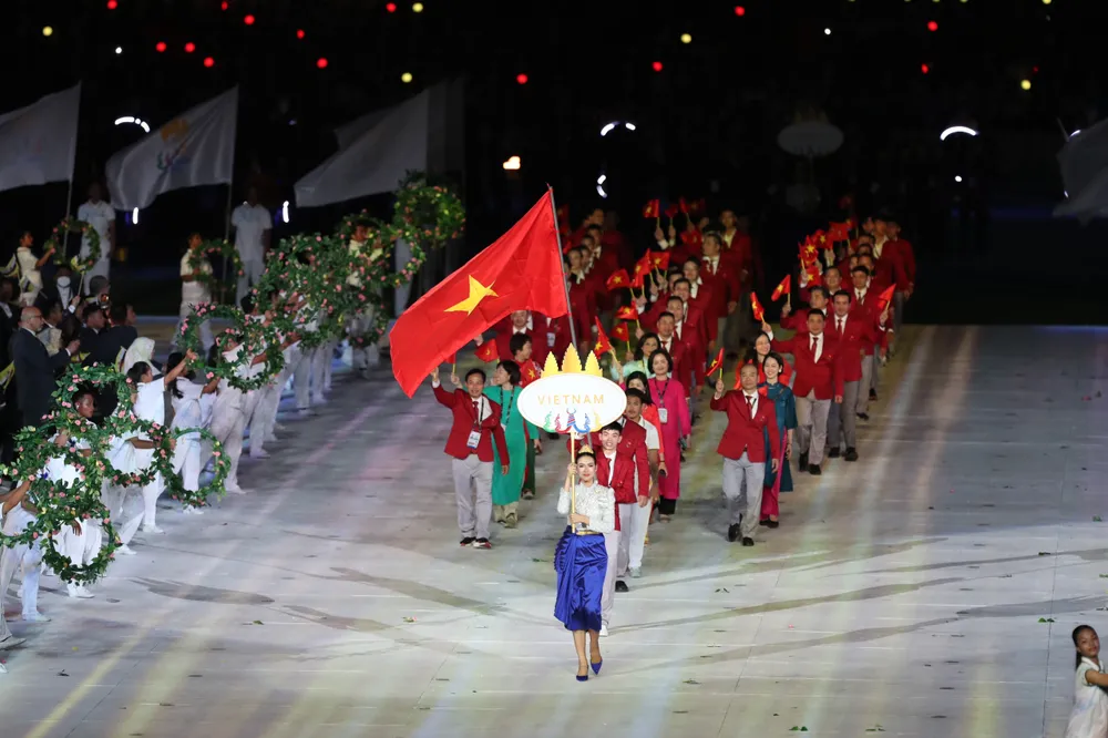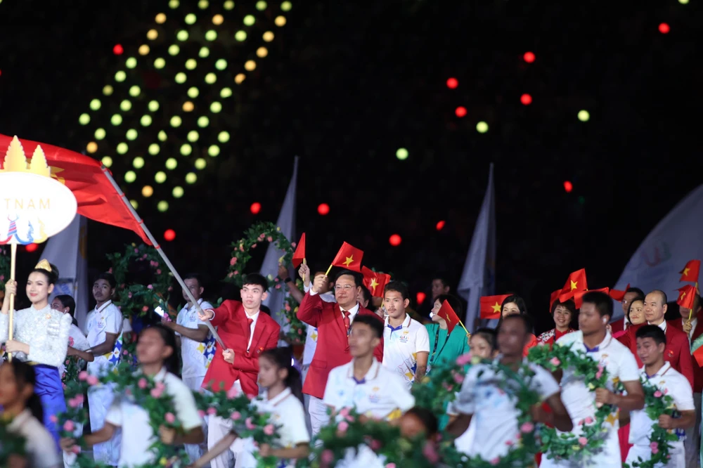 Các đoàn thể thao Đông Nam Á diễu hành. Đoàn đầu tiên diễu hành là Brunei và đoàn cuối cùng là chủ nhà Campuchia. Kình ngư Nguyễn Huy Hoàng vinh dự là VĐV cầm cờ dẫn đầu đoàn thể thao Việt Nam trong lễ diễu hành. |
