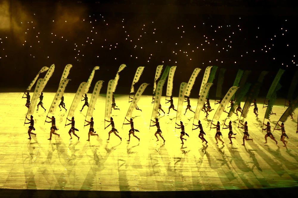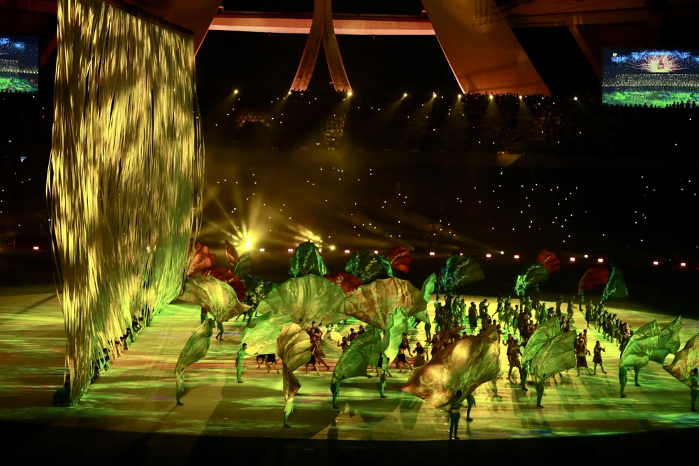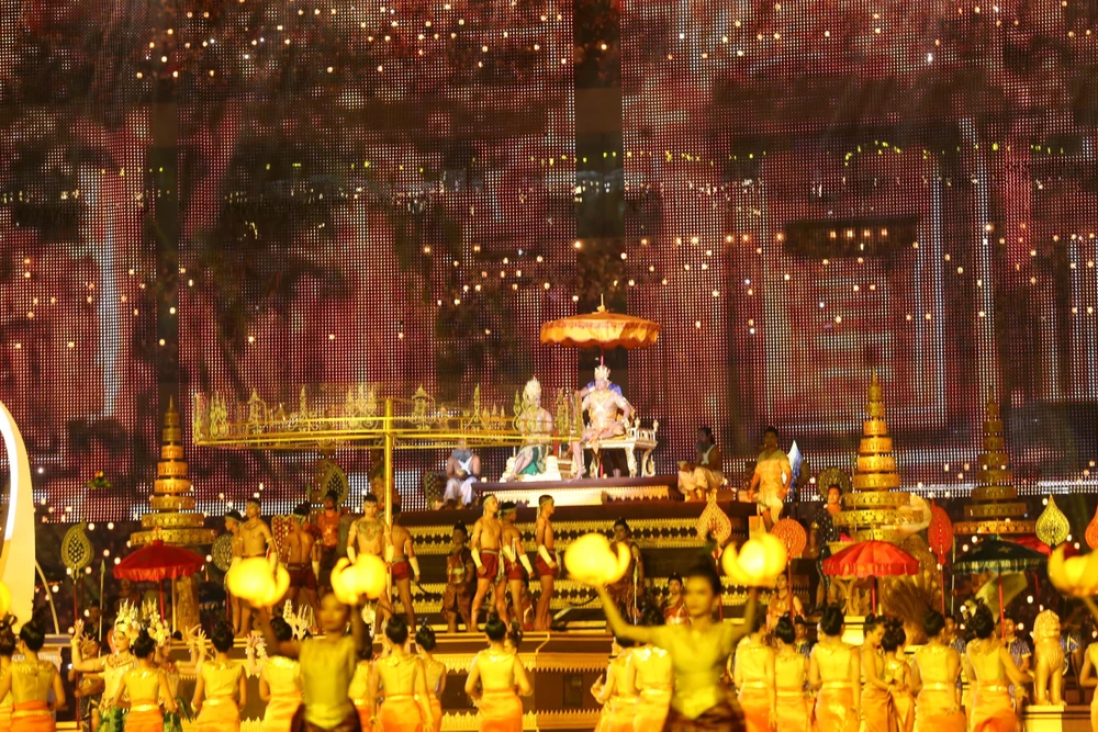 Phần trình diễn “Vinh quang Angkor”. Biểu tượng của Campuchia là ngôi đền huyền thoại Angkor Wat. Nhiều tiết mục tập trung vào nền văn hóa thời Angkor kết hợp biểu diễn múa rối nước và các nghệ sĩ cầm hoa sen trong trang phục Phật giáo, biểu diễn môn thể thao võ truyền thống của người Campuchia – Bokator. |