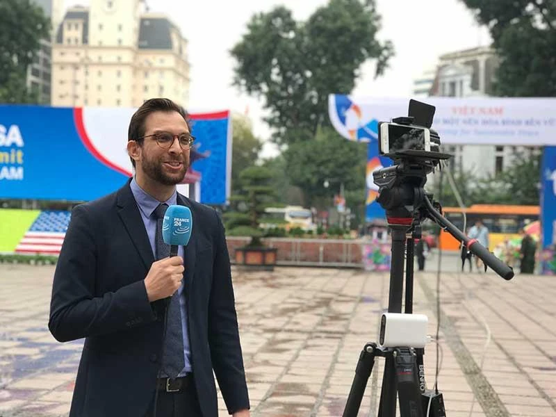 Nhà báo Charles Pellegrin của hãng tin France 24 (Pháp) tác nghiệp sáng 27-2 tại IMC. Ảnh: ĐT