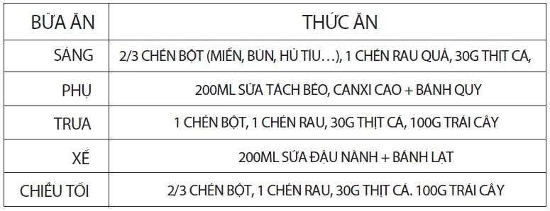 Bác sĩ Đào Thị Yến Phi - Trưởng khoa Dinh dưỡng Đại học Y khoa Phạm Ngọc Thạch TP.HCM hướng dẫn khẩu phần ăn của tuổi xế chiều như sau: “Giảm chất béo và ăn nhiều chất bột thô (cơm, bún, hủ tíu…). Về đạm, nên dùng thịt trắng như cá và đậu hủ nhiều hơn các loại thịt đỏ như thịt bò, hải sản. Có thể dùng thêm vi chất bổ sung”.