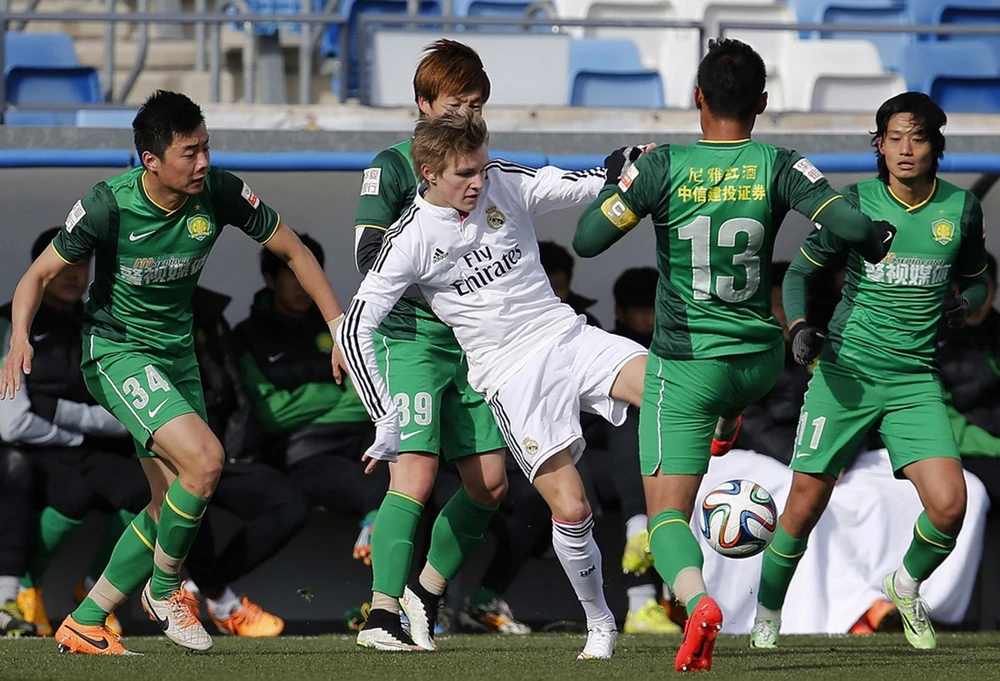 Odegaard trong vòng vây các hậu vệ đối phương trận Castilla đá giao hữu với đội trẻ Bắc Kinh Quảng An.