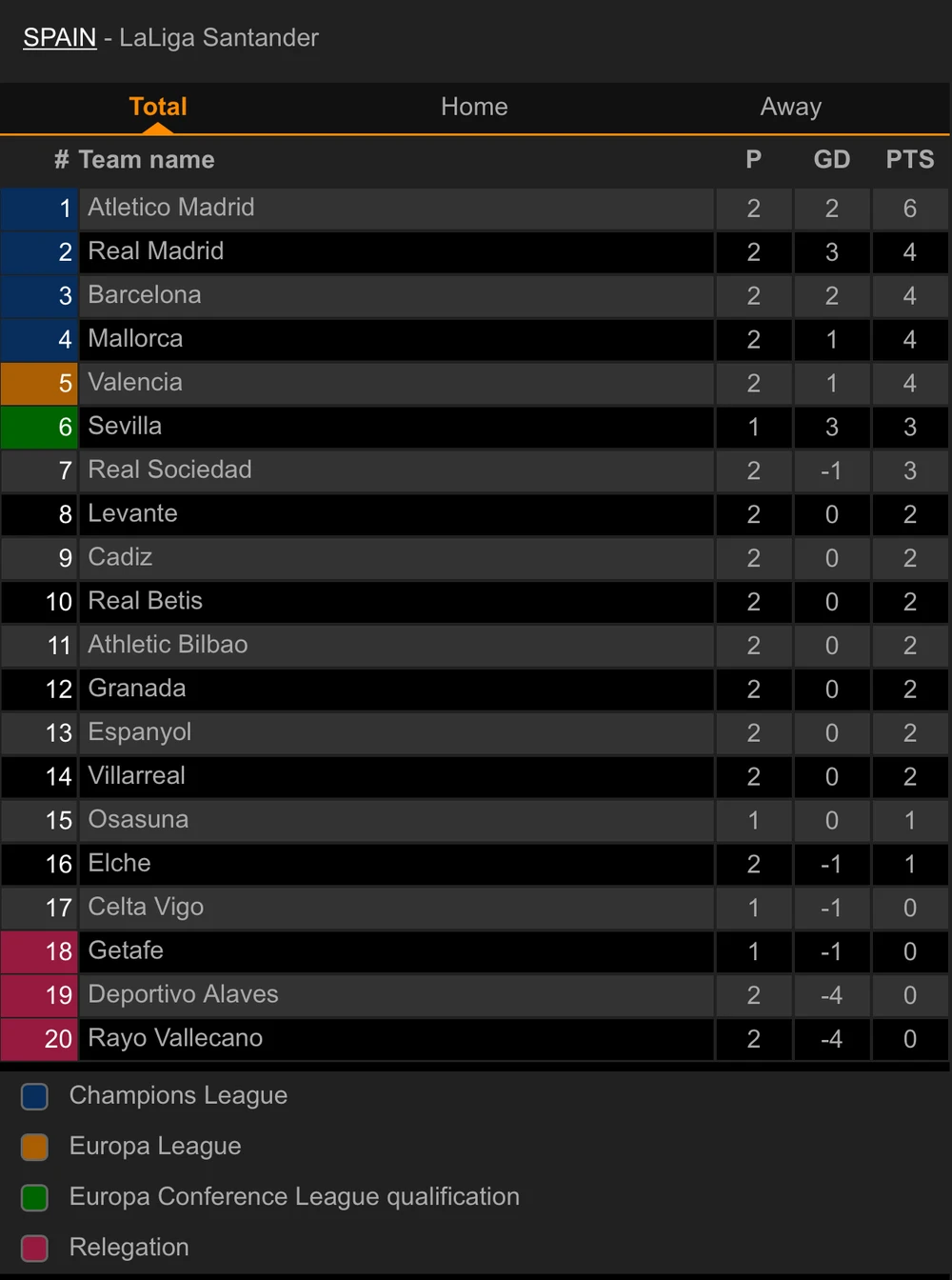 Ngôi đầu bảng La Liga sau vòng 2 thuộc về đội bóng cùng thủ đô là Atletico Madrid. Tại vòng đấu này, ĐKVĐ Atleico Madrid có chiến thắng sát nút 1-0 trước Elche, để lên ngôi đầu bảng với 6 điểm sau 2 trận. Vị trí thứ hai thuộc về Real Madrid với 4 điểm, Barcelona có cùng điểm số nhưng xếp thứ ba do thua Real Madrid về hiệu số bàn thắng.