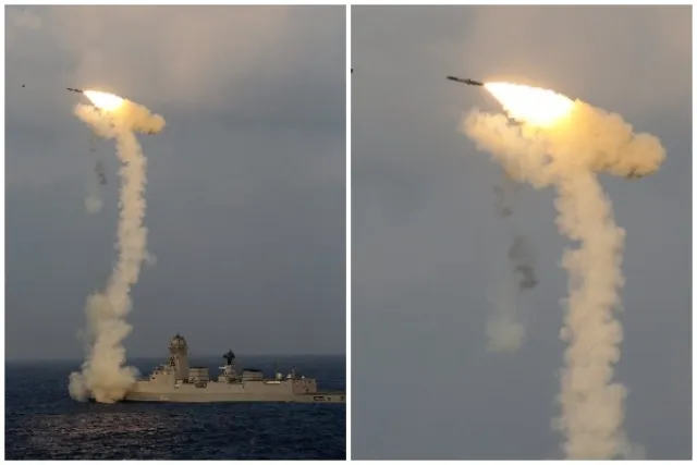 Tên lửa được phóng ra từ tàu khu trục tàng hình INS Chennai do Ấn Độ chế tạo và đánh trúng một mục tiêu trên Biển Ả Rập.