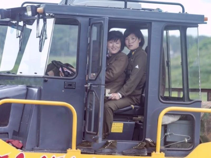 Hai nữ binh sĩ Triều Tiên ngồi trên một máy kéo. Ảnh: PEN NEWS