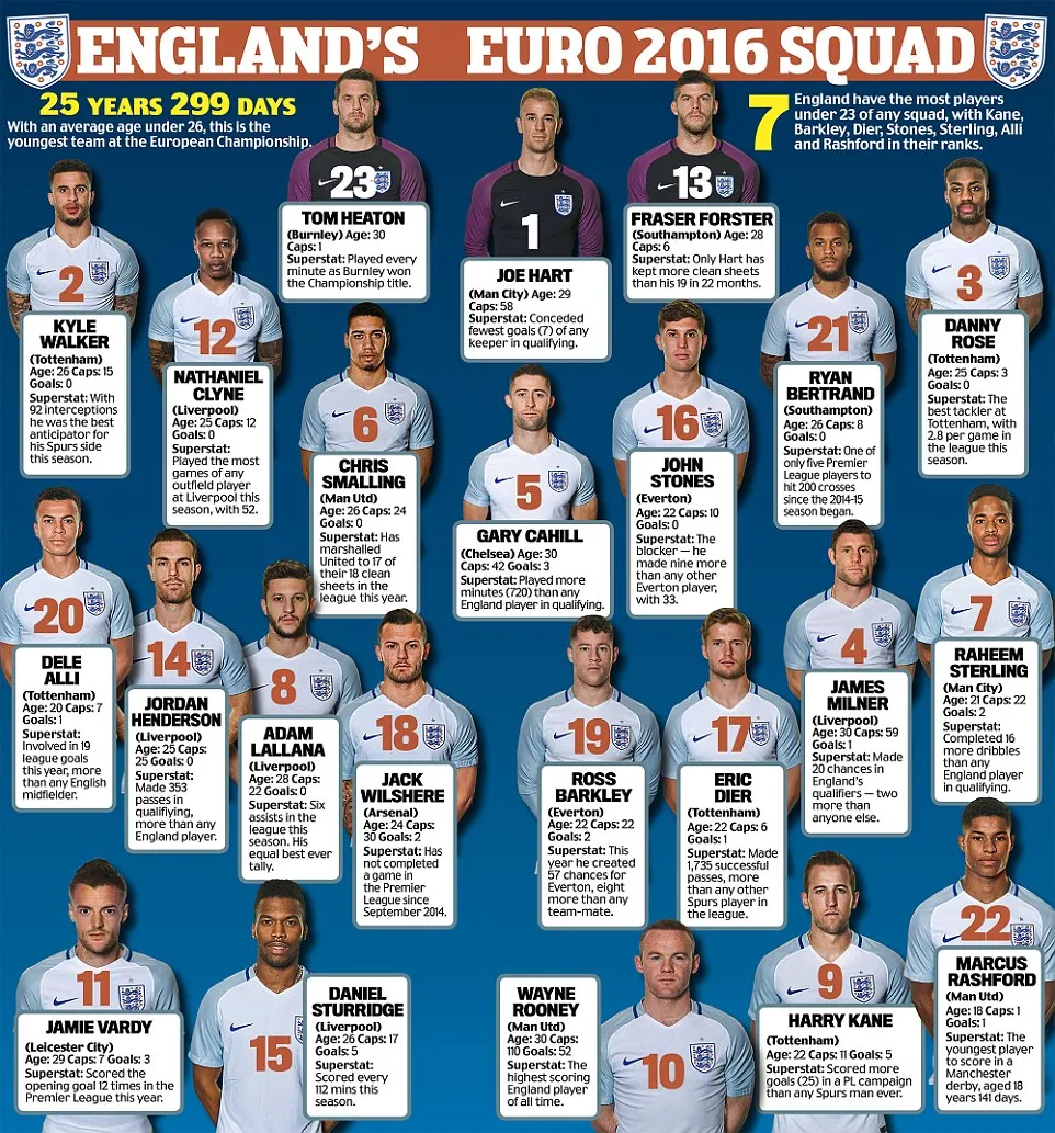 Đến hạn 31-5, tất cả 24 đội tuyển tham dự VCK Euro 2016 đã gút danh sách tham dự giải. Theo đó, tiền đạo Marcus Rashford đã thuyết phục được HLV Roy Hodgson để có mặt trong đội hình tuyển Anh vào giờ chót.