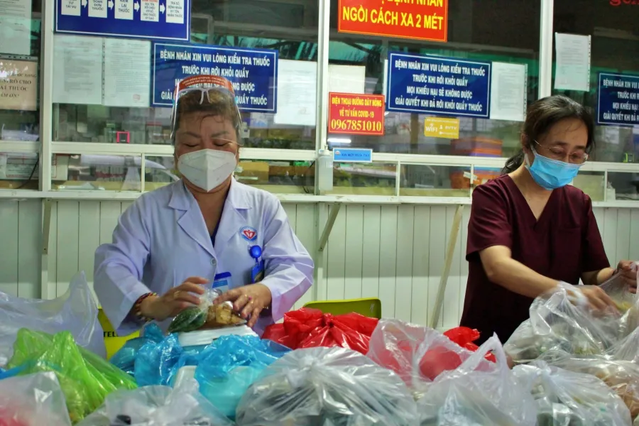 Anh Chính trao đổi với bác sĩ về số lượng cơm mà BV tiếp nhận. Ảnh: NGỌC LÀI