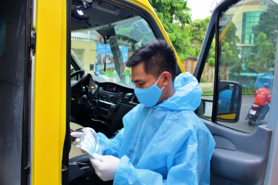 Mặc đồ bảo hộ trước khi điều khiển xe đến giao cơm ở bệnh viện, khu cách ly... Ảnh: NGỌC LÀI