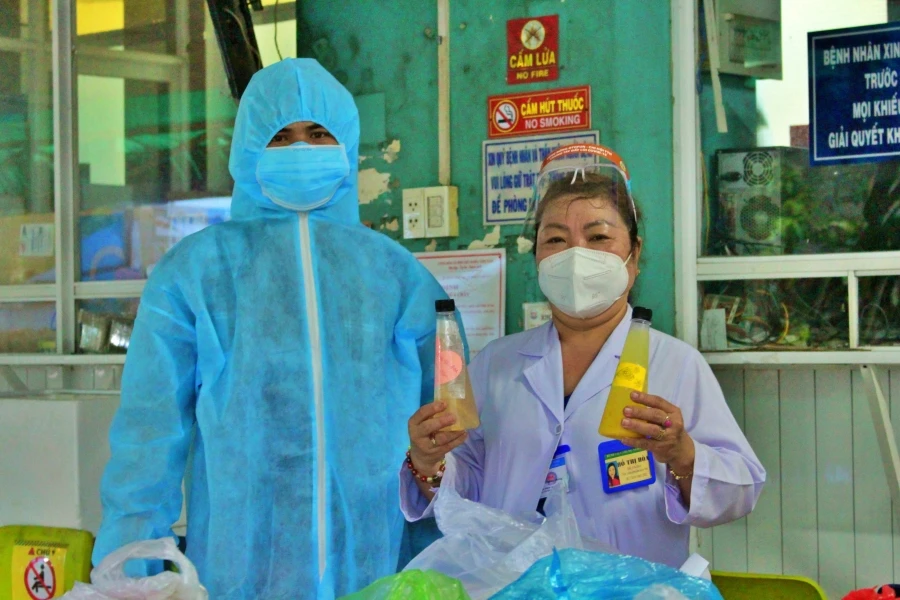 Bác sĩ "khoe" nước ép được anh Chính vận chuyển đến vẫn còn mát lạnh. Ảnh: NGỌC LÀI