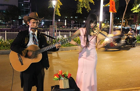 Chủ nhân của âm thanh ấy - người nam vừa chơi đàn vừa thổi harmonica, người nữ phụ họa bằng violon nhịp nhàng với nhau.