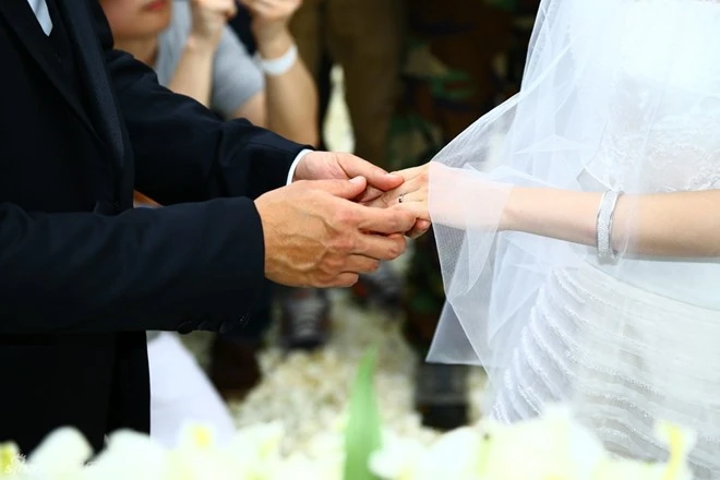 | Cô dâu được cha dẫn vào lễ đường trên con đường rải hoa trắng. |