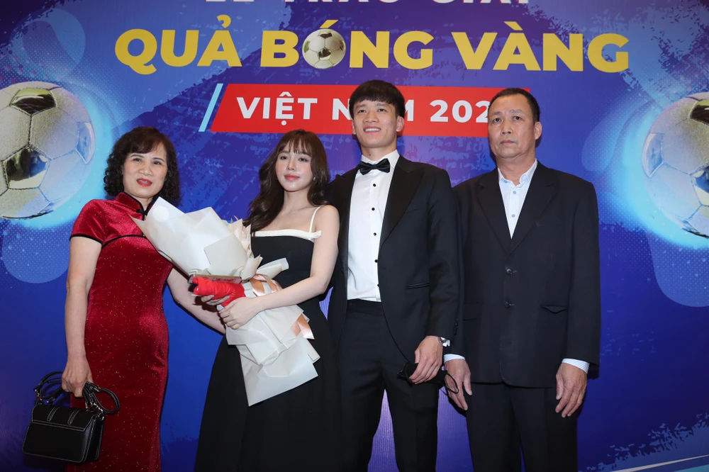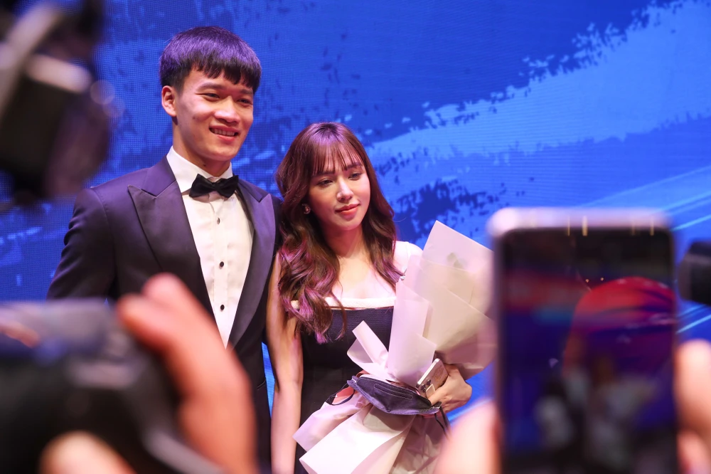 Tiền vệ trẻ của Viettel rạng rỡ bên bạn gái xinh đẹp trong đêm hạnh phúc của sự nghiệp khi lần đầu tiên giành Quả bóng vàng Việt Nam.
