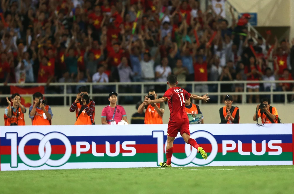 Anh Đức ăn mừng bàn thắng đẹp và anh còn để lại ấn tượng đẹp khi can ngăn cổ động viên ném chai, vật lạ xuống sân. Ảnh: NGỌC DUNG