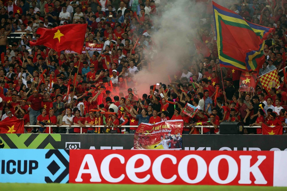 Một số khán giả quá khích không chỉ ném vật thể lạ xuống sân mà còn đốt pháo sáng trên khán đài Mỹ Đình. Ảnh: NGỌC DUNG