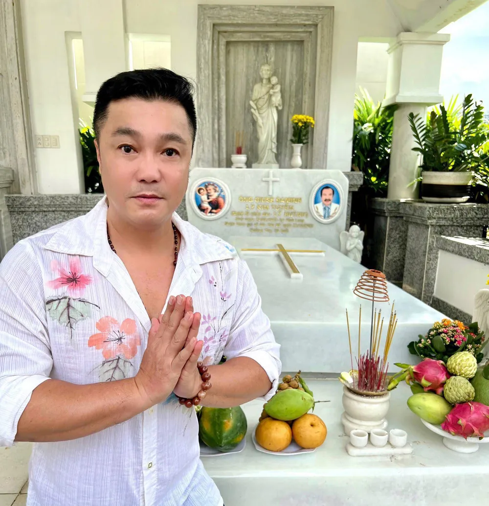 Lý Hùng bên mộ ba NSND Lý Huỳnh. Ảnh: FBNV