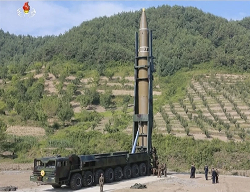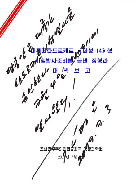 Bức ảnh được KCNA chụp hôm 3-7 và công bố hôm 4-7 cho thấy nhà lãnh đạo Triều Tiên Kim Jong-un ký lệnh tiến hành phóng tên lửa Hwasong-14 được cho là tên lửa đạn đạo liên lục địa tại một địa điểm bí mật.