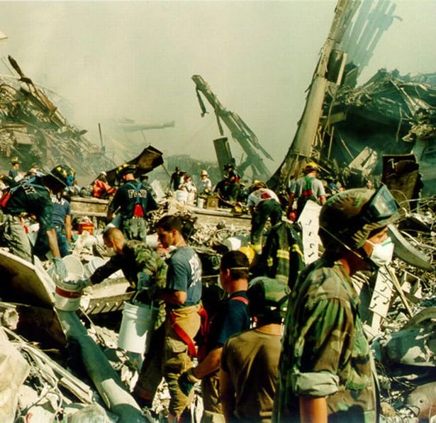 Tòa tháp đôi từng là biểu tượng vĩ đại của nước Mỹ chỉ còn là một đống tro tàn. Ảnh: New York National Guard