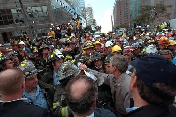Tổng thống George W. Bush động viên cảnh sát, lính cứu hỏa đang gồng mình khắc phục thảm họa sau vụ khủng bố kinh hoàng. Ảnh: George W. Bush Presidential Library