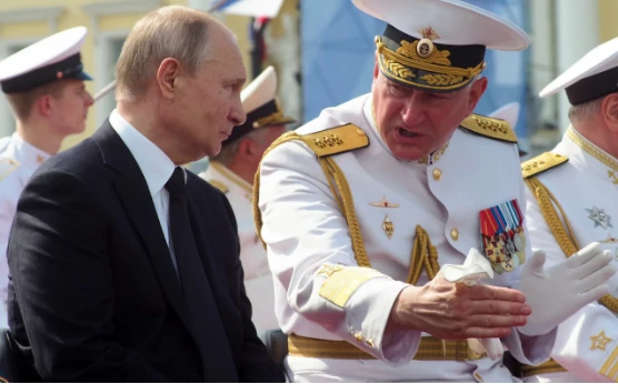 Tổng thống Nga Vladimir Putin (trái) và Tư lệnh hải quân Nga Nikolai Yevmenov trong lễ kỷ niệm ngày hải quân Nga hôm 28-7. Ảnh: Telegraph