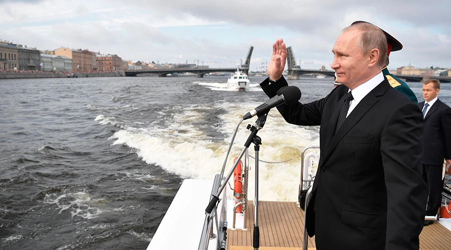 Tổng thống Vladimir Putin giám sát đội tàu trên sông Neva tại TP St. Petersburg. Ảnh: REUTERS