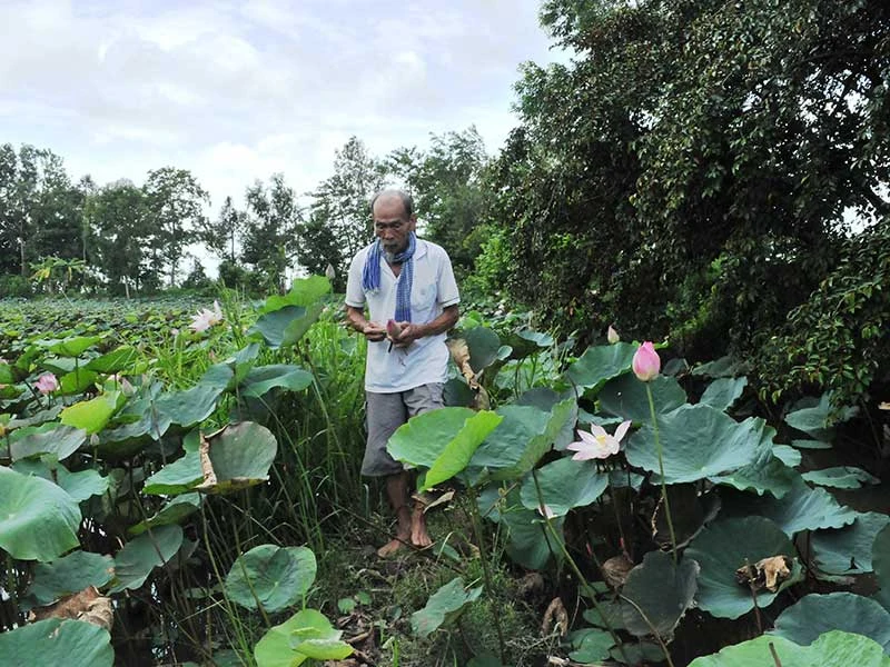 Ông Bảy với tay hái một đài sen, bóc tách lấy ra từng hạt sen đưa cho mọi người ăn chơi. Vừa đi ông vừa chỉ tay những cây mãng cầu, cây xoài mà ông trồng cách đây vài năm đã bắt đầu cho trái. Riêng ruộng sen rộng khoảng 3.000 m2, ông trồng chỉ để cho vui, cho bà con hàng xóm khi cần, chứ không phải vì kinh tế.