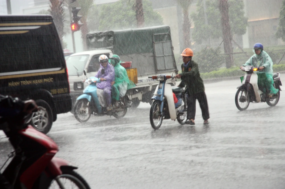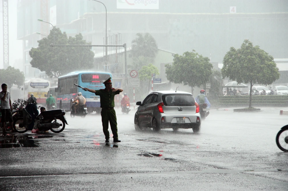 Một chiến sĩ cảnh sát giao thông đội mưa làm nhiệm vụ trên đường Phạm Hùng.