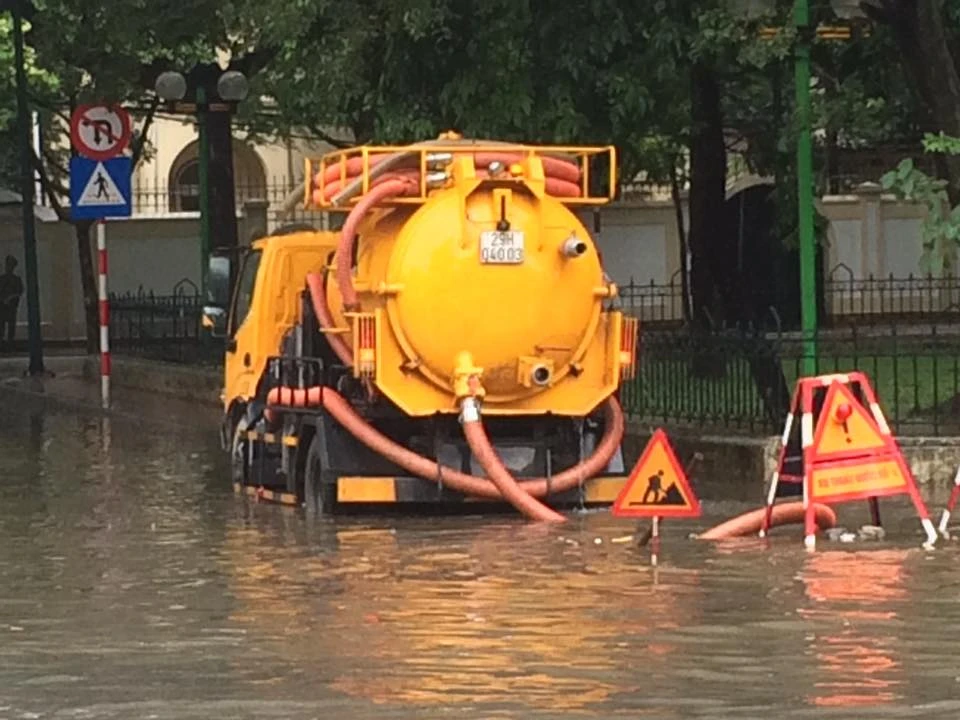 Các nắp cống được mở, kèm theo biển cảnh báo để nước thoát nhanh chóng.