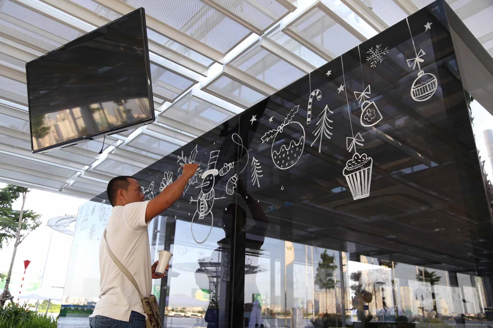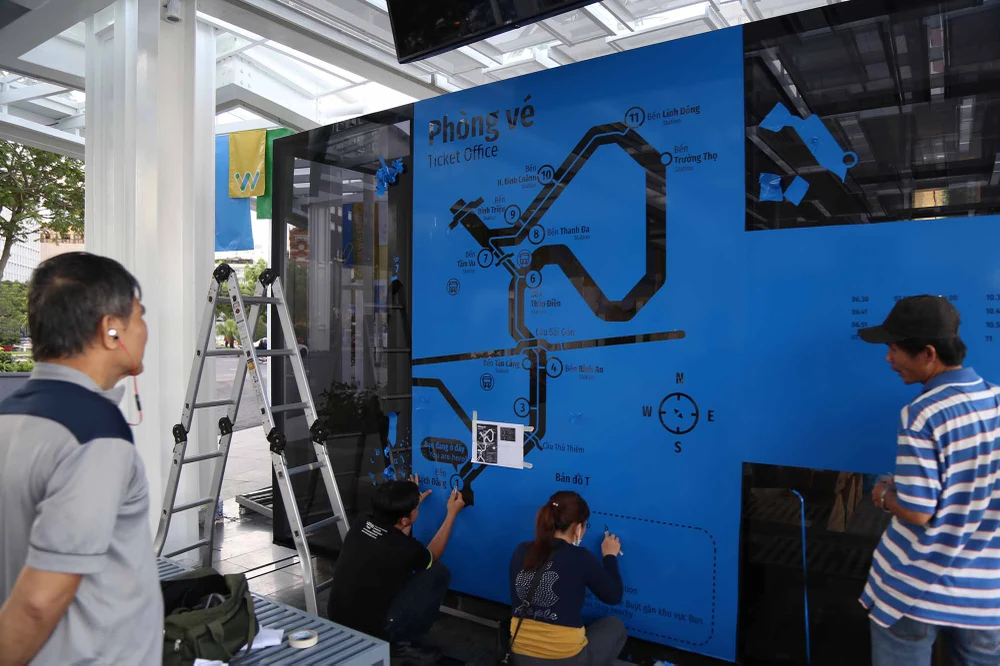 Sơ đồ các bến đón, trả khách của tuyến tàu buýt đang được hoàn thành trước khu vực phòng vé.