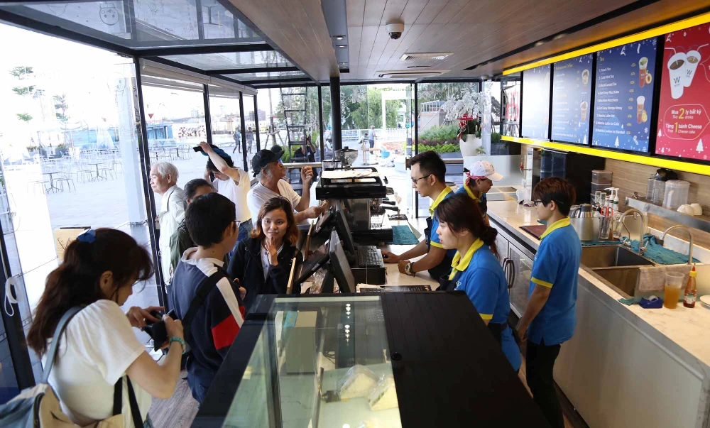 Bên trong quán cafe phục vụ du khách đi tàu và khách bên ngoài.