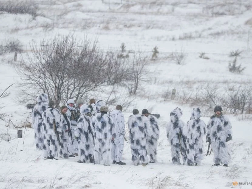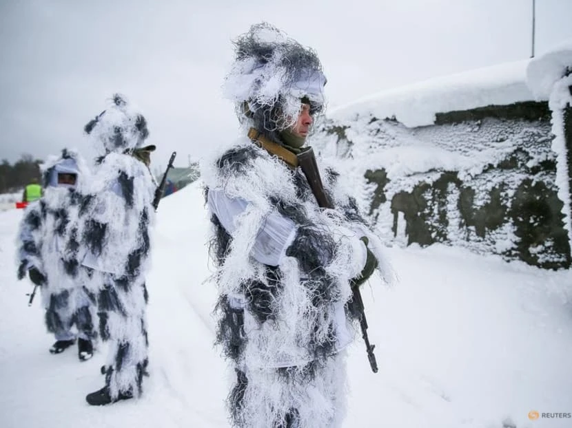 Các binh sĩ huấn luyện trong trang phục màu đen trắng để ngụy trang vào mùa đông.