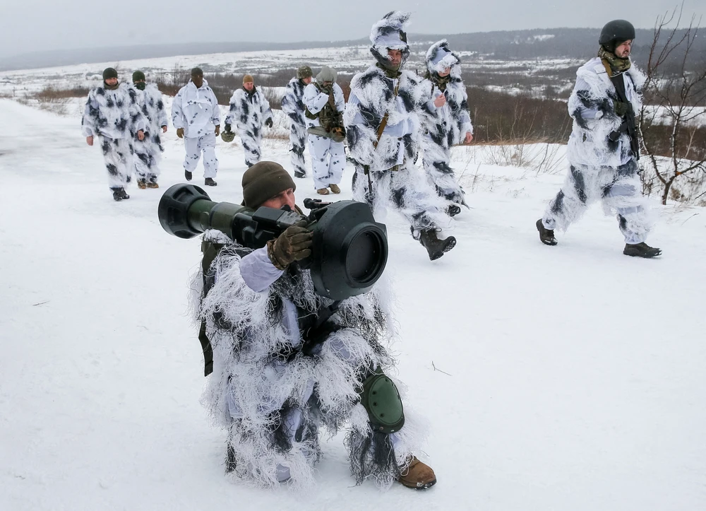"Chỉ cần bắn một lượt là đủ để tiêu diệt hoàn toàn phương tiện của đối phương" – binh sĩ Zinovy Luzhansky đề cập các tên lửa chống tăng do Anh cung cấp trong buổi tập tại khu huấn luyện quân sự phía tây nước này hôm 28-1.