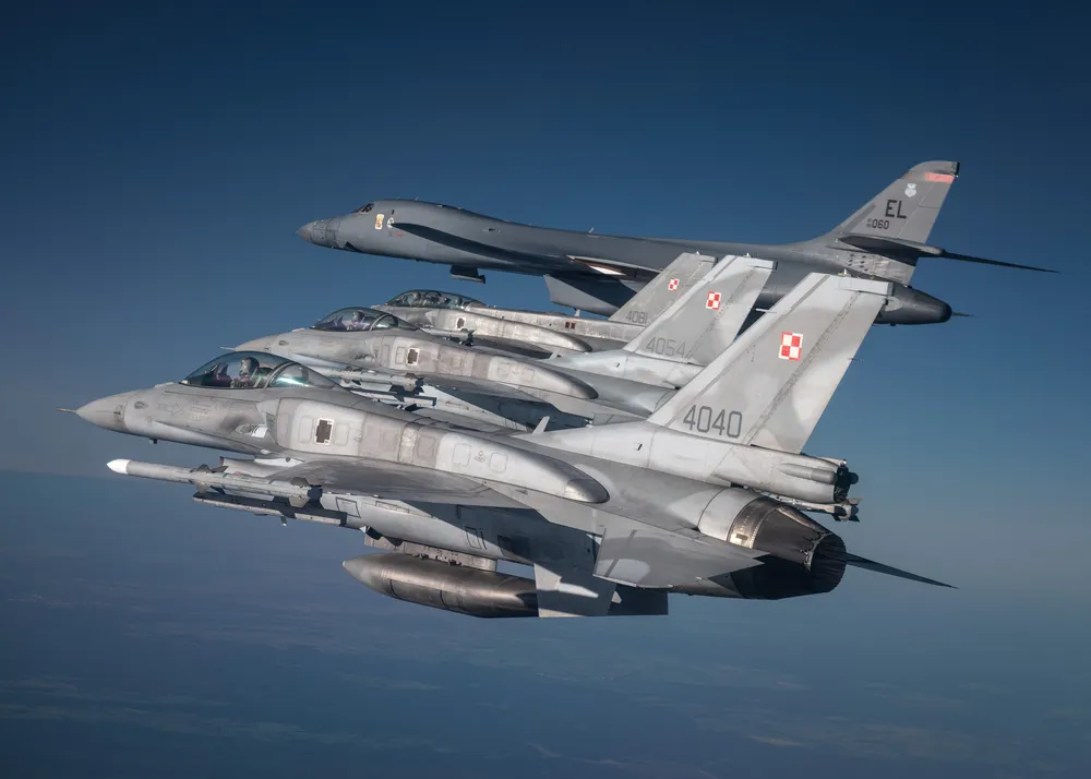 Ba máy bay F-16 của Ba Lan (phía gần) diễn tập chung với máy bay B-1B của Mỹ ở biển Đen. Ảnh: KHÔNG QUÂN BA LAN
