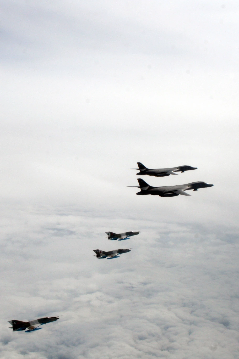 Ba máy bay MiG-21 (phía gần) của Romania diễn tập chung với hai máy bay B-1B của Mỹ ở biển Đen. Ảnh: KHÔNG QUÂN ROMANIA