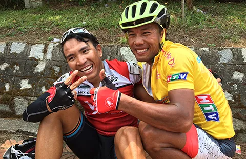 Trường Tài cám ơn người đồng đội đàn anh Mai Nguyễn Hưng luôn lăn xả thi đấu vì thành tích chung của xe đạp TP.HCM và đã giúp Trường Tài bảo vệ áo vàng, đồng thời ghi tên mình vào lịch sử xe đạp Việt Nam. Ảnh: MQ