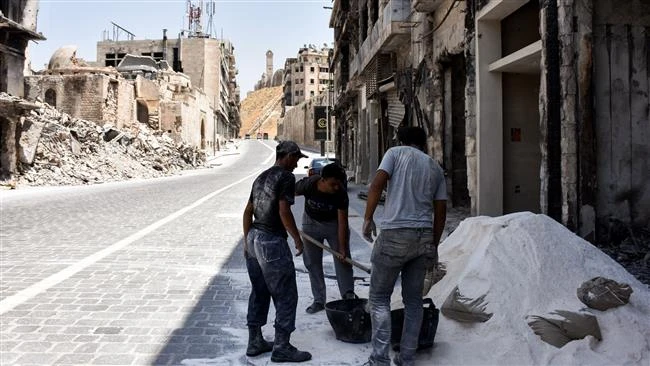 Một nhóm công nhân xây dựng xây dựng lại một cửa hàng bị tàn phá trong các cuộc không kích ở chợ Khan al-Wazir, thành cổ ở Aleppo hồi tháng 7-2017. Ảnh: AFP