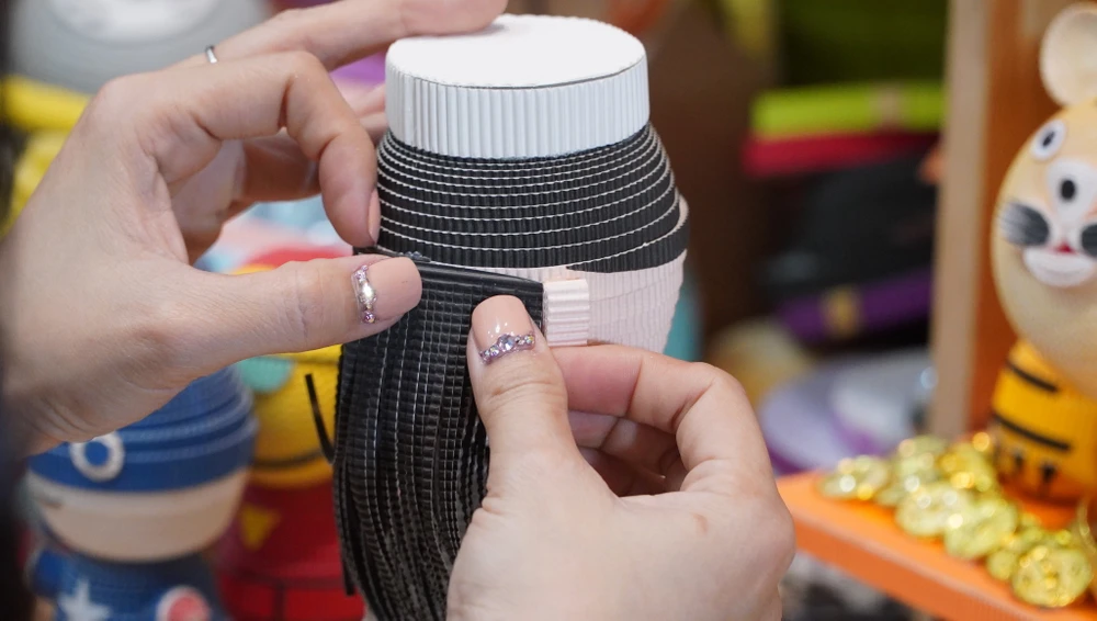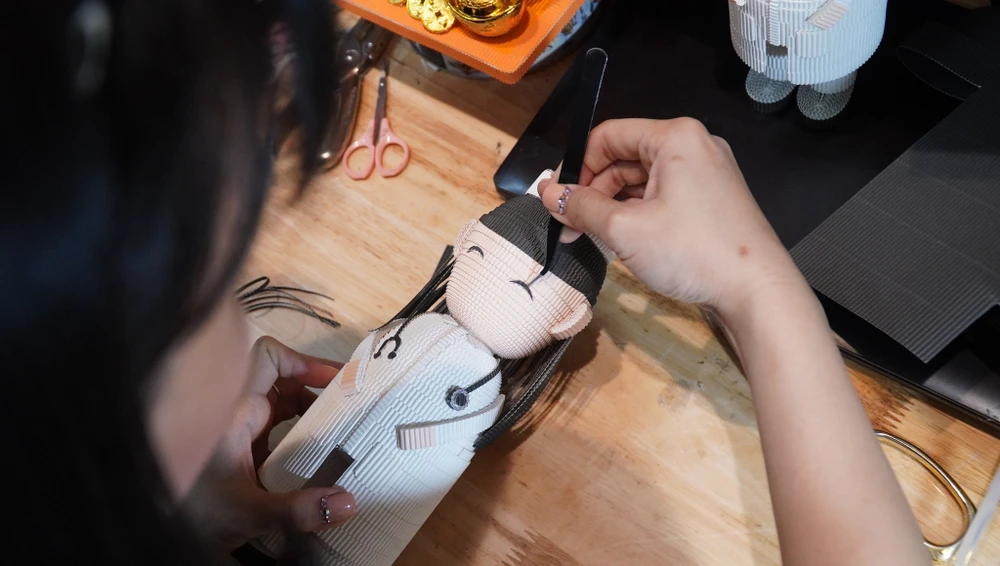 Chị Thương tình cờ biết đến loại hình xếp giấy Kami từ bốn năm trước. Lúc đó chị được một người bạn tặng con búp bê giấy có hình thù rất dễ thương xếp bằng loại giấy lượn sóng. Bị thu hút bởi hình thù và cách gấp giấy, chị Thương quyết định gác công việc nhân viên văn phòng để tìm tòi và sáng tạo với bộ môn này. Ảnh: MINH TÂM
