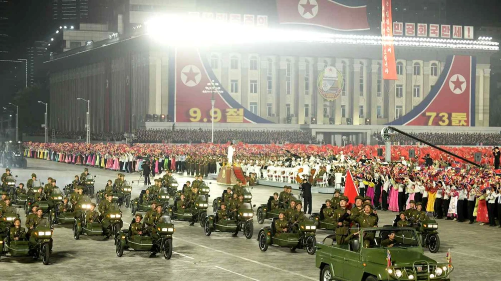Lễ duyệt binh kỷ niệm 73 năm thành lập nhà nước Cộng hòa Dân chủ Nhân dân Triều Tiên. Ảnh: KCNA/REUTERS