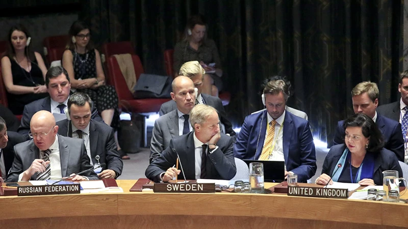 Đại sứ Nga tại LHQ Vasily Nebenzya (trái, hàng đầu) và Đại sứ Anh tại LHQ Karen Pierce (phải, hàng đầu) trong cuộc họp ngày 6-9. Ảnh: AP