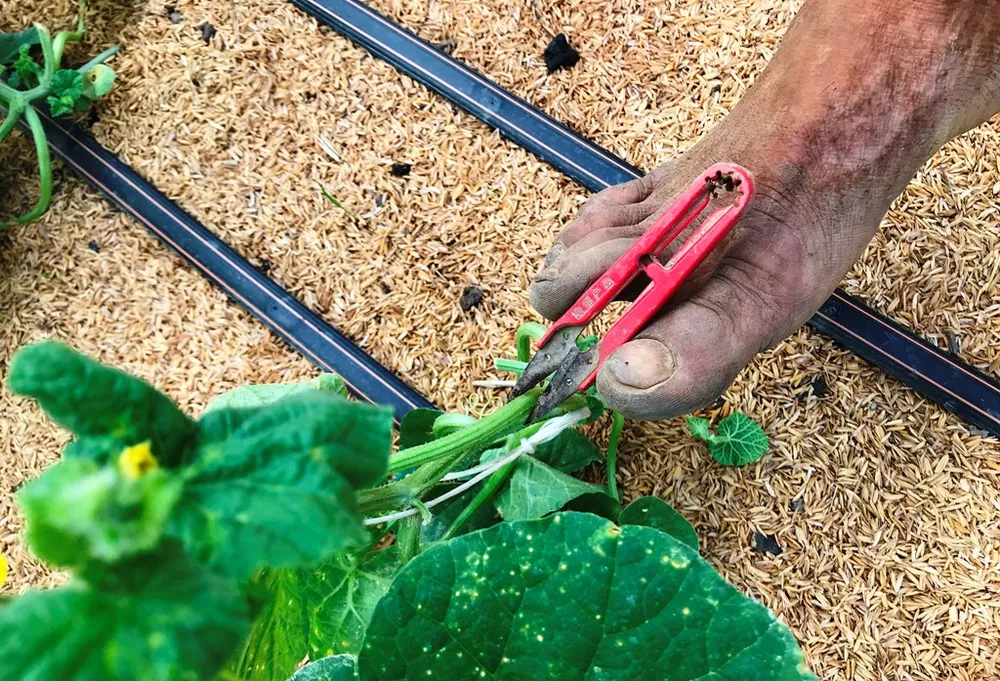 Anh Cường tỉa lá dưa lưới đang ra hoa bằng chân. Ảnh: HẢI HIẾU