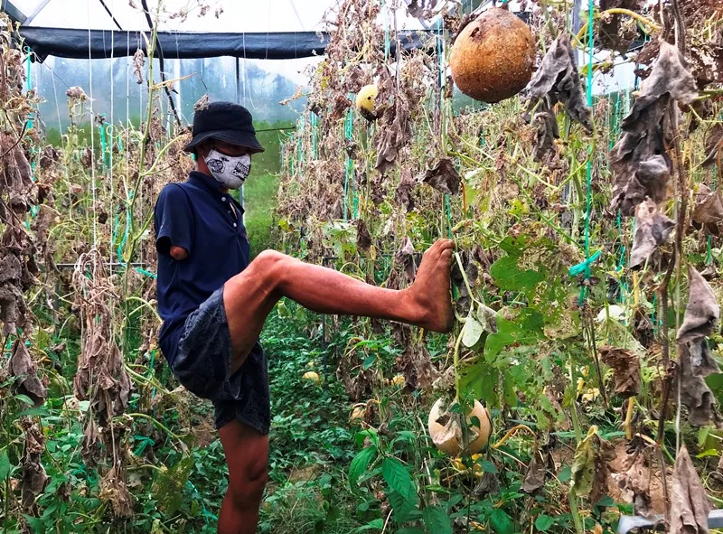 Nhưng hiện tại, dưa lưới nhà anh Cường bán không ai mua, trái rụng thối đầy vườn. Tương lai của hai vợ chồng và hai đứa nhỏ mù mịt. Nếu dịch bệnh vẫn tiếp diễn, anh Cường lo mình không trụ nổi trên chính đôi chân và cũng là tay của mình nữa.