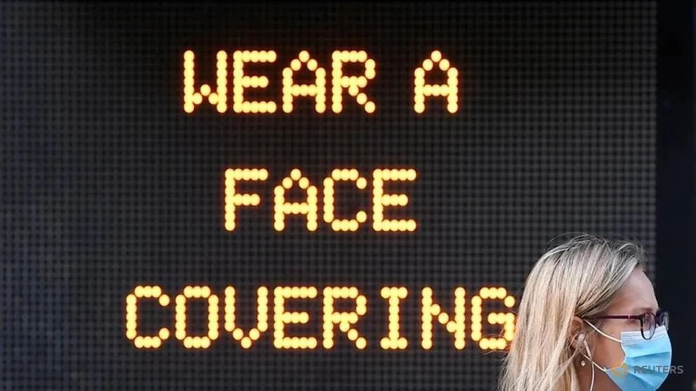 Bảng thông tin yêu cầu đeo khẩu trang tại khu tài chính Canary Wharf ở thủ đô London (Anh). Ảnh: REUTERS