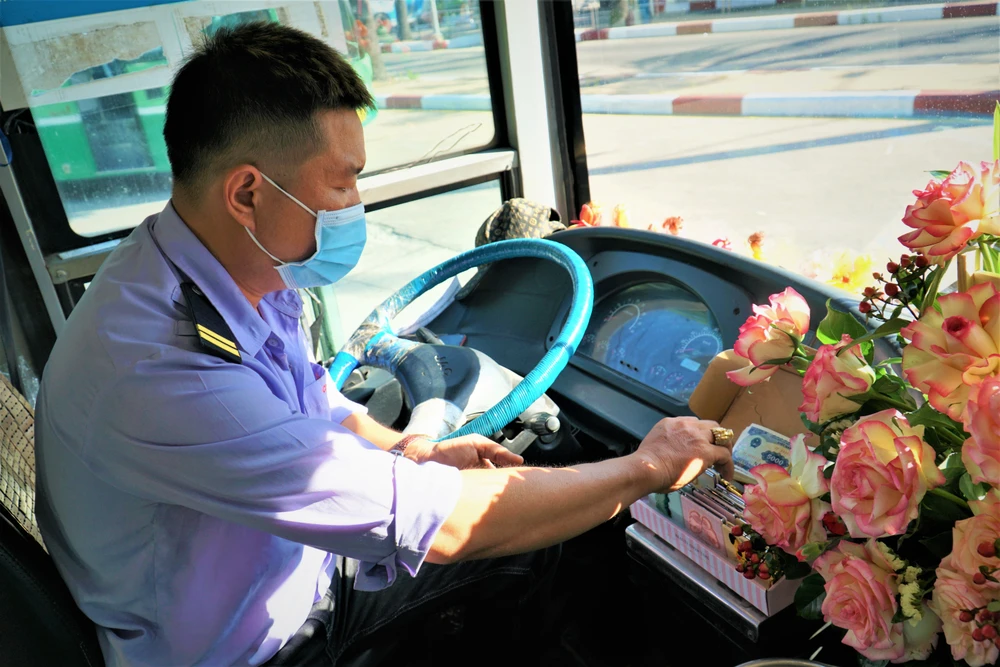 Tài xế Huy dừng xe tặng hoa, quà cho hành khách nữ.