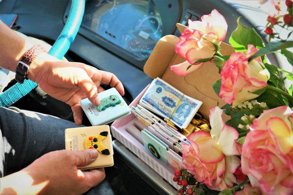 Trên xe đầy ắp hoa và quà được chuẩn bị tươm tất từ trước.