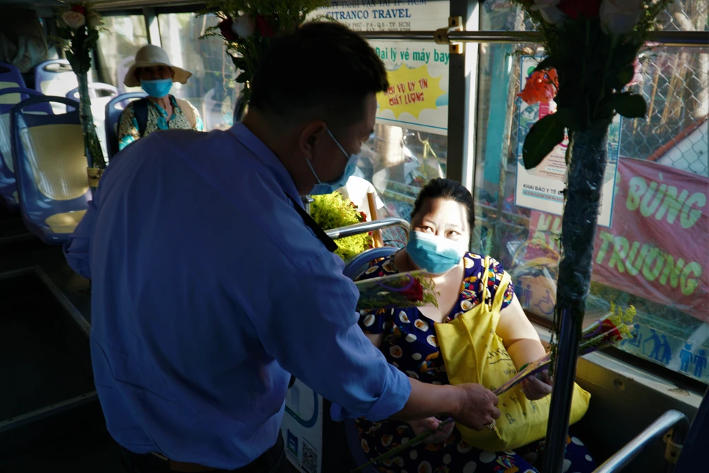 6 giờ sáng, chuyến xe buýt của tài xế Lê Xuân Huy (40 tuổi, ngụ quận Tân Phú, TP.HCM) bắt đầu xuất bến từ Công viên 23-9 (quận 1, TP.HCM) đến cầu Long Kiểng (huyện Nhà Bè, TP.HCM). Hôm nay, chuyến xe số 86 có phần “khác lạ” hơn bình thường. Ngay đầu xe, anh Huy đã chuẩn bị một giỏ hồng thật to cùng nhiều món phụ kiện nhỏ như móc khoá, gương, kẹo socola,... phía sau xe thì treo đầy bông hồng đỏ. Được biết, đây đã là năm thứ 4 nam tài xế tổ chức tặng quà ngày 8-3 trên xe buýt.